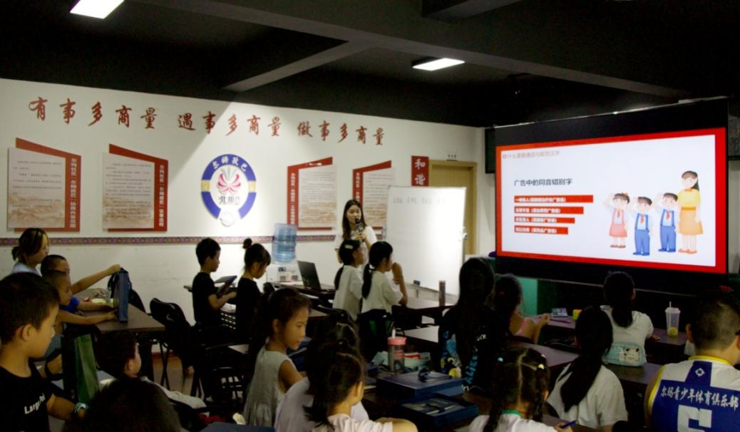 实践团成员蒋雪向社区儿童介绍广告中的同音错别字