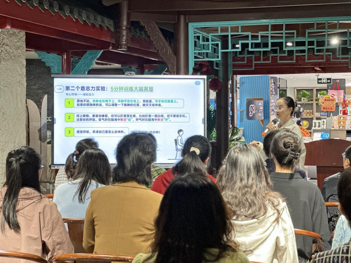 活动以讲解和互动的形式交替进行,邓香怡老师细致解读书籍核心内容,带领在场教职工依次开展九项意志力体验实验。大家积极参与回忆自我抉择、五分钟大脑冥想、调节呼吸节奏等互动环节,踊跃答题交流、分享感悟思考,在沉浸式体验中探寻掌控自控力的方法,收获内心的从容与平静。
