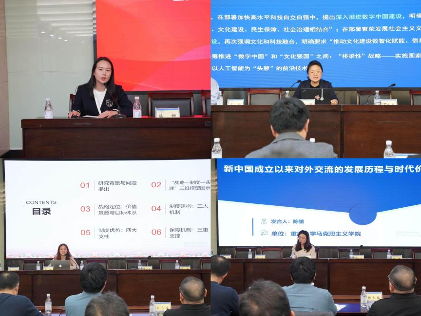 西南政法大学马克思主义学院院长、教授商爱玲阐释了新时代共产党人精神谱系生成逻辑、核心要义与实践转化路径。中国社会科学院当代中国研究所社会室副主任、研究员吴超提出“理、礼、利、力” 构建中华文明标志体系,在习近平文化思想指引下,该体系对坚定文化自信意义重大。湖南省社会科学院历史所所长、研究员李斌以纵向视角分享文旅融合中遗产保护与旅游开发的关系处理,既回顾了新中国成立后文旅结合的演变历程,也提及文物曾遭遇的破坏,而这些早期实践为当下相关工作提供了重要借鉴。重庆邮电大学马克思主义学院院长、教授谢俊基于马克思文明观阐释数字文明新形态的显著二重性,在技术、生产、经济维度均呈现进步性与矛盾性并存的特征。重庆大学马克思主义学院教授陈飞从马克思实践观出发,指出实践是文化之源且兼具双重品格,决定文化的传统沉淀与未来开放性,其主体性内涵对建设中华文化共同体意义重大。安徽工业大学马克思主义学院院长、教授郑洁梳理了2013年至2025年习近平文化思想相关文献及高频关键词,并展示知识图谱,期望学界从科学内涵等方面深化研究,创新方法,推动学科融合。